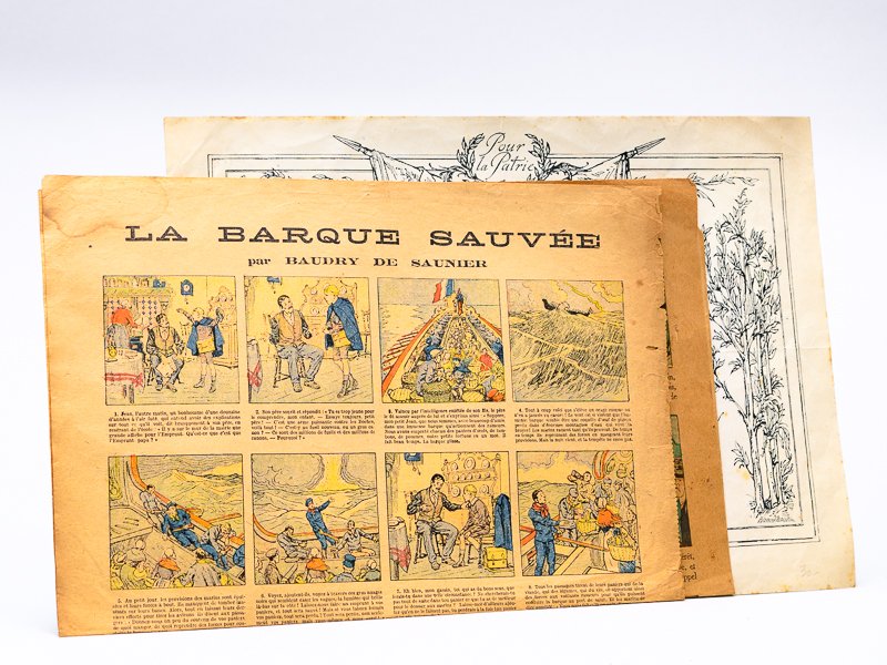 3 feuillets in-folio, Souscription Nationale : Imprimerie P. Orsoni, Editeur A. Bodard - La Barque Sauvée par Baudry de Saunier, Publications Omnia, Paris - Certificat de participation à l'Emprunt de la Défense nationale : "Monsieur Biais a participé à l'Emprunt de la Défense Nationale", Bernard Naudin, 1915 Prix du lot pour ces 3 pièces intéressantes relatives au même thème. Etat très satisfaisant (qq. frott. et petites mouill. discrètes)