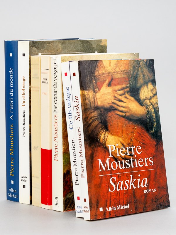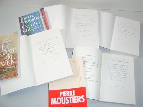 7 vol. in-8 br., A l’abri du monde, sous jaquette illustrée, Albin Michel, Paris, 1997, 362 pp. - Saskia, Albin Michel, Paris, 199, pp. - Ce fils unique, Albin Michel, Paris, 2000, 201 pp. - L’Eclat, NRF, Gallimard, 1989, 217 pp. - Un aristocrate à la lanterne, NRF, Gallimard, 1986, 243 pp. - Le coeur du voyage, sous jaquette illustrée, Editions du Seuil, Paris, 1981, 285 pp. - Un si bel orage, Albin Michel, 1991, 249 pp. Bon ensemble (qq. frott. ou rouss. sur qq. vol., mouill sur tranche de “Ce fils unique”, bons exemplaires par ailleurs), dont chacun des 7 ouvrages a été dédicacé par Pierre Moustiers à l’académicien, grand médecin, poète et humaniste, le professeur Jean Bernard. Prix du lot pour ce bel et rare ensemble éclectique enrichi de magnifiques envois de l’auteur à un dédicataire prestigieux. Avec signature de l'auteur
