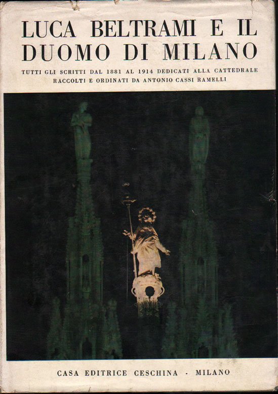 In-4 p., tela editoriale, sovracoperta (lievi strappi e mancanze al dorso), pp. XXXII,489, con un ritratto del Beltrami applicato alla pagina, 56 tavole di illustrazioni in bianco e nero fuori testo e 51 figure nel testo relative al Duomo nelle varie epoche. Raccolta di tutti gli scritti di Luca Beltrami, da lui pubblicati tra il 1881 ed il 1914, e attinenti il Duomo di Milano, la sua facciata e la sua piazza. In buono stato (good copy).