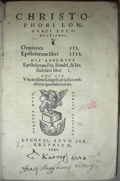 LUCUBRATIONES. Otariones III. Epistolarum libri IIII. His appensus Epistolarum Pet. Bembi & Iac. Sadoleti liber I. Una cum vita eiusdem Longolij ab ipsius amicissimo quodam exarata.