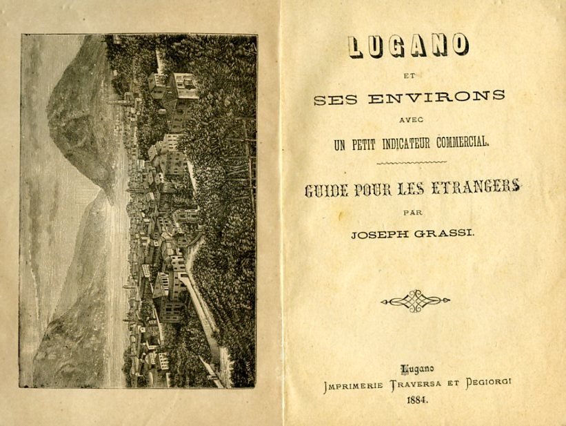 In-16°, pp. 100 + 64 di annunci commerciali di alberghi, ristoranti, negozi e ditte commerciali di Lugano impressi su carta azzurra, rosa, verdina. Brossura editoriale riquadrata. Veduta xilografica della città all'antiporta. Una tav. xilografica f.t. ripiegata con vedute dell'Hôtel du Parc e della Villa Beau-Séjour. Qualche minima traccia d'uso. Buon esemplare. Prima e unica edizione di rara guida della città di Lugano e dei suoi dintorni.