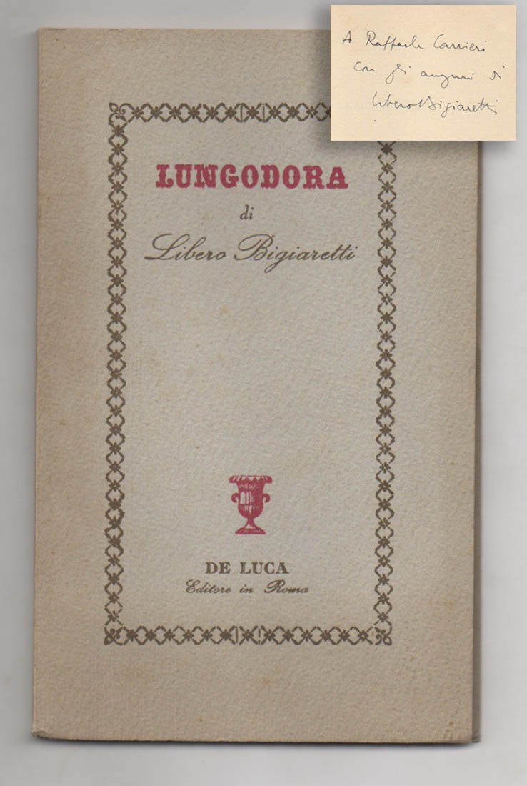 LIBROPrima edizione.CON AUTOGRAFO.Ottimo esemplare intonso. Dedica autografa dell’autore a Raffaele Carrieri.Raccolta di versi. «Nella raccolta «Lungodora», che nel titolo richiama la posizione della casa in cui il poeta visse ad Ivrea, egli si lascia alle spalle il passato, che la poesia ha riscattato dalla sua pena».Alfredo Luzi, «Libero Bigiaretti: la storia, le storie, la scrittura: atti del convegno, Matelica, 21-22 marzo 1998», pagina 258.