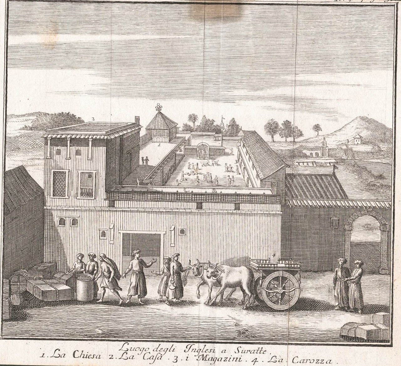 Luogo degli Inglesi a Suratte ( 1.la chiesa- 2. la cala- 3.i magazini- 4.la carozza ).Lo stato presente di tutti i paesi e popoli del mondo naturale, politico e morale con nuove osservazioni e correzioni degli antichi e moderni viaggiatori.