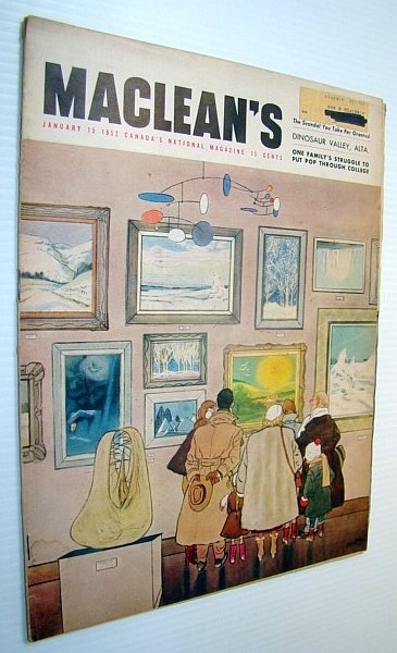 - Maclean's - Canada's National Magazine, 15 January 1952 Allis-Chalmers AD-40 heavy-duty grader, How Doctor Robert (Bob) Greig's family put him through college, to become a dentist, Movie Censorship - The Scandal You Take For Granted - Canada's, eight censorship boards sometimes ban a film without ever seeing, it, and their red tape adds half a million dollars to your theatre, tickets annually, Why Jews Don't Get Drunk - scientists are attempting to discover, why alcoholism among Jews is twenty times more rare than among, some gentile groups, Dinosaur Valley, Alberta - article with colour photos, How to Start Worrying and Stop Living, Conn Smythe, That Man in the Greens (Part 2) - article plus several photos of, Mr. Smythe with celebrities, Trouble Shooters Shouldn't Fall in Love, The Cops Who Change Diapers - Policewomen in Montreal, Workers earn money by putting ideas in the suggestion box, Len Norris cartoon at a small-town rink, Great colour Coke ad on back cover shows smiling delivery Man, Canadiana Magazine Back Issues