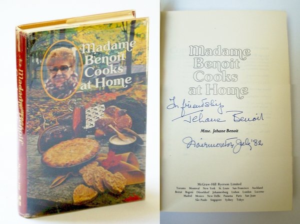 Signed "In Friendship" upon title page by the author in July 1982 in her home town of Noirmouton, Quebec. "Here at last the legendary Madame Benoit opens the door to the kitchen in her own home, at her sheep farm near Sutton in the Eastern Townships of Quebec. She tells about the joys of cooking at home with her family, and she shares recipes that are her own personal and family favorites from the many she has collected and developed over the years." - dust jacket. "Jehane Benoit is a remarkable woman, filled with exhuberance, warmth and love. Her cooking reflects these qualities. I couldn't wait to get my copy - and to use it." - Bruno Gerussi. xiii, 335 pages. Colour photos. Book clean and unmarked with moderate wear. Above-average wear to dust jacket which is now preserved in mylar. Surely a treasured addition for any serious Canadian cookbook collection. Book