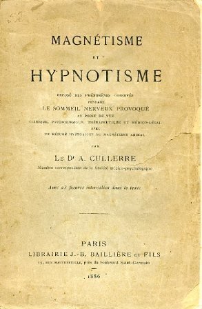 In-8°, pp. VIII, 381, (6) di catalogo editoriale, 36 di altro catalogo delle ultime novità di Baillière et fils per l'anno 1886. Brossura editoriale a stampa (con dorso restaurato). 23 figg. xilografiche intercalate n.t. Perfetto esemplare. Edizione originale di questo pregiato studio sul magnetismo animale e l'ipnosi. Dopo un excursus storico su tali fenomeni sino al XIX secolo (con diffusi cenni su Mesmer, Braid, Charcot, ecc.) l'autore discorre dei fenomeni generali associati all'ipnosi, delle allucinazioni e degli impulsi da essa indotti, della suggestione in stato di veglia, della catalessi, delle reazioni fisiologiche che si accompagnano allo stato ipnotico, dell'ipnosi considerata sotto il prospetto terapeutico e sotto quello psicologico, nonché della regolamentazione che il diritto deve porre a problemi correlati con l'ipnotismo stesso, come la possbiltà di indirizzare ad azioni criminali un soggetto che versa in stato ipnotico. Il Culllerre, nato nel 1849 (non è nota la data del suo decesso), era socio corrispondente della Société médico-psychologique di Parigi. Lasciò, tra le altre opere La theraputique suggestive et ses applications aux maladies nerveuses et mentales, a la chirurgie, a l'obstetrique et a la pedagogie; Les enfants nerveux: education et prophylaxie; Nervosisme et nevroses: hygiène des enerves et des nevropathes . Caillet, 2723: 'Cet ouvrage est un résumé concis de tout ce qui a paru d'important depuis quelques années sur le sommeil magnétique et hypnotique et une étude sur les origines de cette science'. Crabtree, 1131: 'A study written for the layman. It discusses research findings in hypnotism by such as Charcot and Bernheim and places them in the context of the history of animal magnetism'. Dorbon-Ainé, 954. Manca al De Guaita.