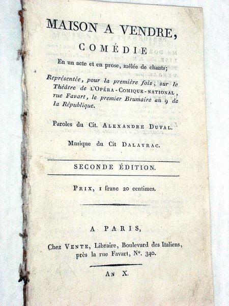 Maison à vendre, Comédie en un acte et en prose, mêlée de chants; Representée, pour la première fois, sur le Théâtre de l'Opéra-Comique-National, rue Favart, le premier Brumaire an 9 de la République. Musique du Citoyen Dalayrac. Seconde édition.
