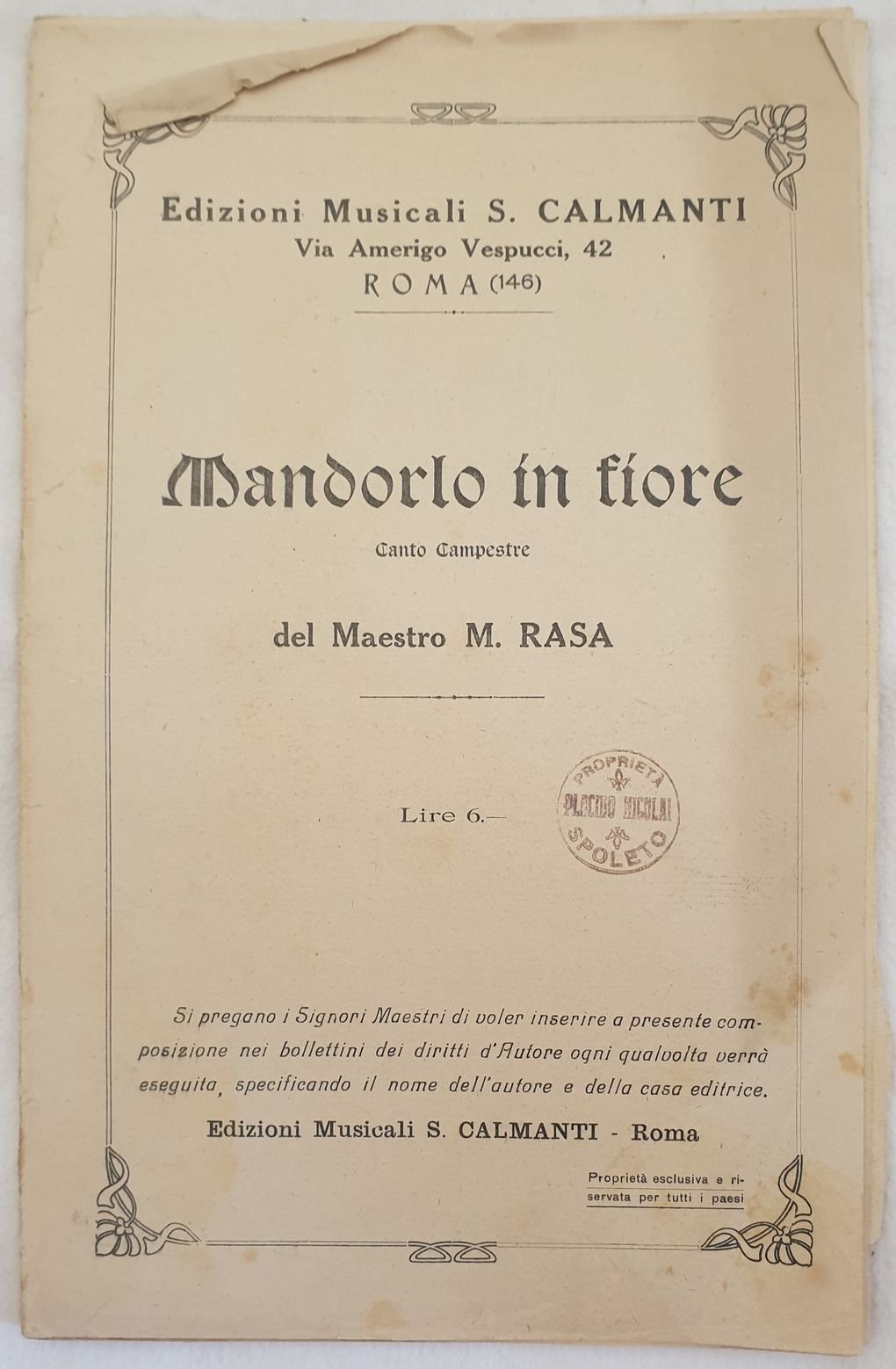 Partitura completa per orchestra degli anni '30 della melodia "Mandorlo in fiore" di M. Rasa.<BR>Copertina morbida editoriale.<BR>GENERE: Canto campestre<BR>STRUMENTI: pianoforte, violini; violoncello, contrabasso, tromba trombone, oboe, clarino, flauto, harmonium batteria ANNO: anni '30 DIMENSIONI: In 8. cm 27x17<BR>PAGINE: pp. 17 CONDIZIONI: Discrete condizioni. Piatti staccati. Ex libris in copertina Complete score for orchestra of 1930's of the melody "Mandorlo in fiore" by M. Rasa Editorial soft cover. MUSIC: Chant STRUMENTI: piano, violin; violoncello, contrabbass, trumpet , trombone, oboe, clarion, flute, harmonium drums YEAR: 1930's SIZE: In 8. cm 27x17<BR>PAGES: pp. 17 CONDITIONS: Fair conditions. Paltes detached. Ex libris in the cover <BR><BR>