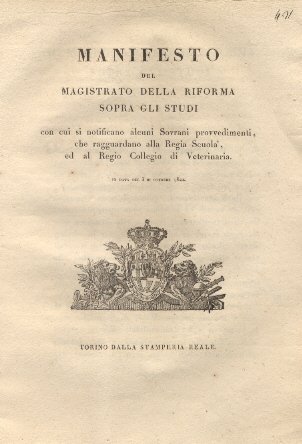 Manifesto del Magistrato della Riforma sopra gli Studi con cui si notificano alcuni Sovrani provvedimenti, che ragguardano alla Regia Scuola, ed al Regio Collegio di Veterinaria.3 ottobre 1822.
