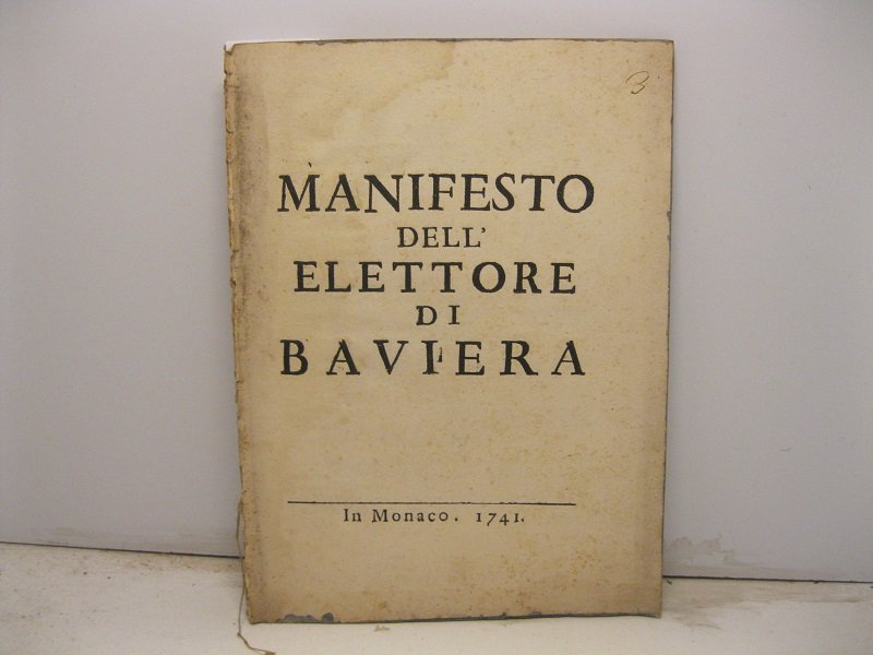 In 8, pp. 23 + (1b). Testatina, capilettera e finalini xilogr. Leggere gore, non fastidiose, alle cc. Br. rifatta con carta d'epoca. Testo contenente i diritti della Casa di Baviera sui regni e gli Stati appartenuti al defunto Carlo VI.