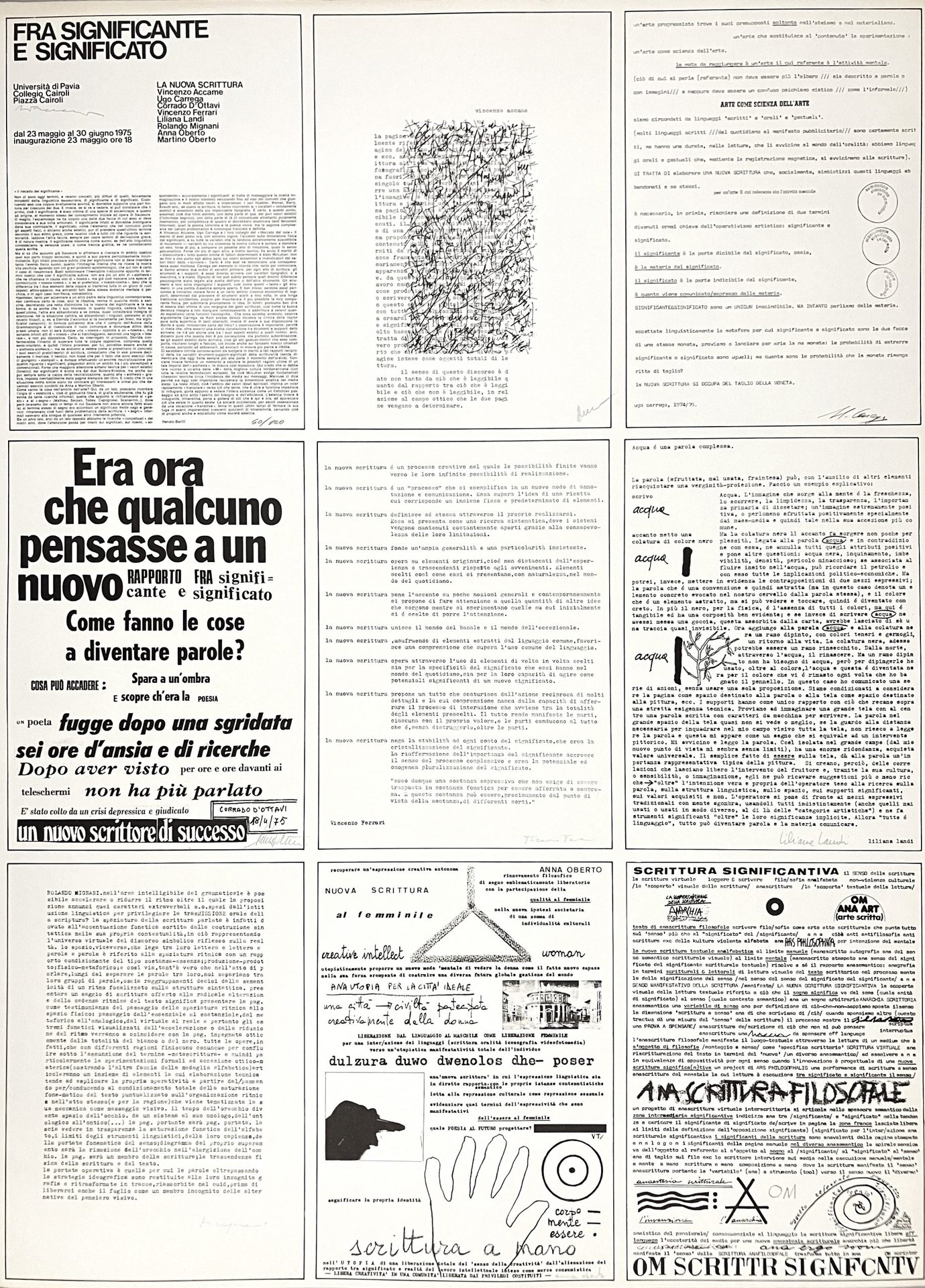 Stampato su cartoncino in occasione della Mostra di Poesia Visiva presso lo Studio Rotelli di Finalborgo, con la partecipazione di Vincenzo Accame, Ugo Carrega, Corrado D'Ottavi, Vincenzo Ferrari, Liliana Landi, Rolando Mignani, Anna Oberto, Martino Oberto. Gli interventi degli artisti sono riprodotti in 8 riquadri differenti, ciascuno firmato a matita, con l'aggiunta del testo di presentazione di Renato Barilli, "Il riscatto del significante", firmato e accompagnato dalla giustificazione di tiratura (es. 60/100). Disponibile anche la copia stampata su carta semplice fuori dalla tiratura e non firmata.