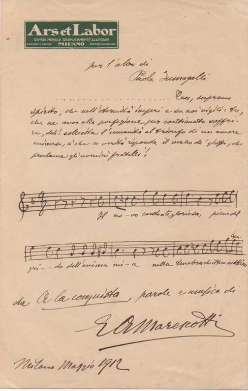 AUTOGRAFOLa carta è stata scritta “Per l’albo di Paola Fumagalli”. Parole e musica di Marescotti tratte da “A la conquista”.