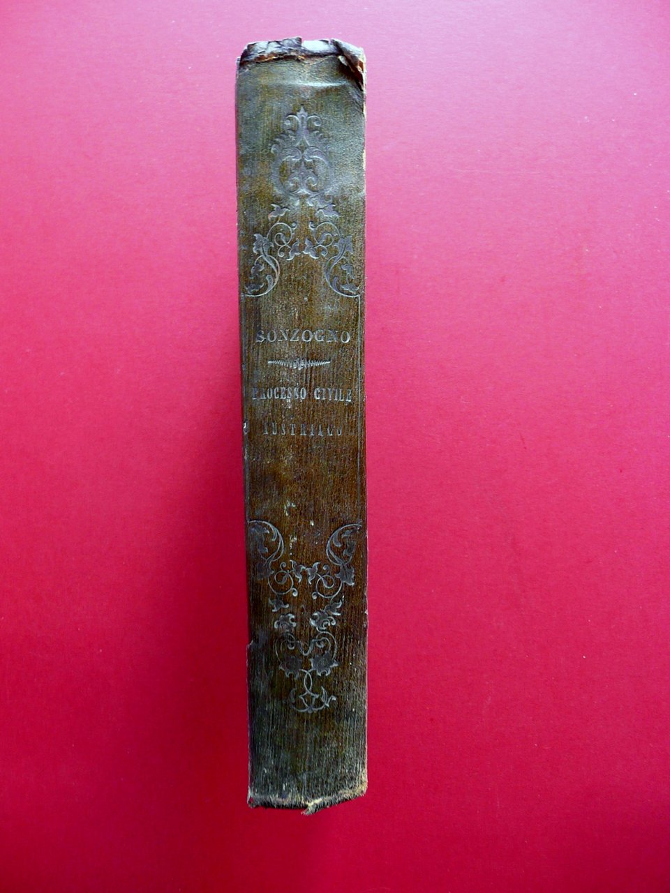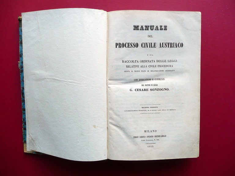 Manuale del Processo Civile Austriaco o sia raccolta ordinata delle leggi relative alla civile procedura giusta il nuovo piano di organizzazione giudiziaria con spiegazioni e commenti del dottor in legge G. Cesare Sonzogno seconda edizione Presso Lorenzo Sonzogno, Milano 1855; cm 23x15; pp. VI-656; legatura d'epoca in mezza pelle con titolo e fregi impressi in oro al dorso; piatti marmorizzati. Condizioni di conservazione Esemplare in buono stato con tracce d'uso; piatti con alcune lievi abasioni e aloni, piccoli strappetti e mancanze ai margini; dorso con perdita della doratura al titolo e ai fregi, qualche piccola mancanza e abrasione alle cuffie e alle cerniere. Interni buoni con piccole lievi bruniture. SETT197.L19066 N