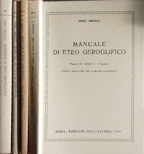 Manuale di Eteo Geroglifico. Parte I:Grammatica.pp.112. Parte II: Testi.1a serie, i testi neo-etei più o meno completi.pp.143, XVIII tavv.ripieg.ft. Parte II:Testi.2a e 3a serie.pp.341. Parte II:Tavole.2a e 3a serie.XVII tavv.2 carte ripieg.12 figg.bn.in alcune tavv.