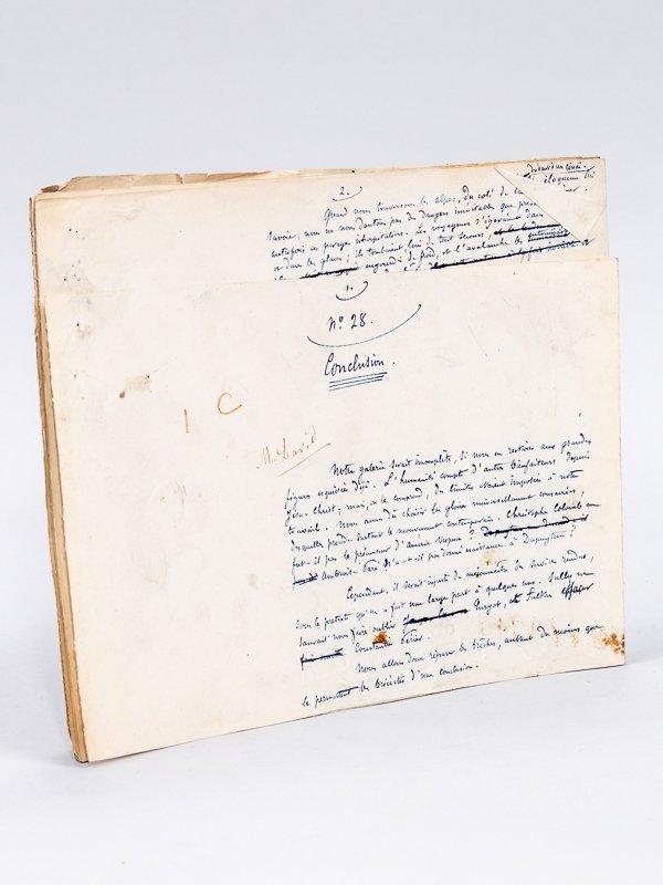 Rappel du titre complet : Manuscrit autographe : Conclusion du Panthéon des Hommes Utiles [ Texte du chapitre de conclusion de l'ouvrage "Le Panthéon des Hommes Utiles", par Gustave Chadeuil et Hippolyte Lucas, publié chez Dentu, 1862 Il évoque : Saint Bernard des Alpes, Jacques Coeur, Wilhelm Buckels, Amerigo Vespuce, Galilée, Jean Bouvet, Ch Rollin, Turgot, W Howes, Constantin Périer, Valentin Haüy, Bertholet, Jecker, Clarkson, Wilberforce, Dupuytren, Carcel, Franchot, Daguerre, Niepce, Sauvage, Morton, Simpson, Chappe, Morse ] Ecrivain et journaliste français né à Limoges en 1823, Gustave Chadeuil, publia vite des romans et nouvelles dans une foule de journaux. Entré au Siècle comme critique musical, il sera l'un des fondateurs du Journal le XIXe siècle en 1871. Il rédigea le "Panthéon des Hommes Utiles" en collaboration avec Hippolyte Lucas, chaque auteur se partageant les biographies. Il s'agit du manuscrit autographe de la conclusion de cet ouvrag. Chadeuil évoque les savants suivants : Saint Bernard des Alpes, Jacques Coeur, Wilhelm Buckels, Amerigo Vespuce, Galilée, Jean Bouvet, Ch Rollin, Turgot, W Howes, Constantin Périer, Valentin Haüy, Bertholet, Jecker, Clarkson, Wilberforce, Dupuytren, Carcel, Franchot, Daguerre, Niepce, Sauvage, Morton, Simpson, Chappe, Morse. On observe de nombreuses corrections et repentirs de l'auteur. Bon état (noms des typographes et abréviations destinées à l'imprimeur portés en marge, piqûres d'aiguilles en marge gauche)