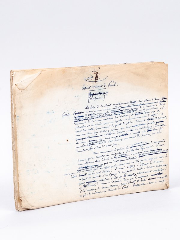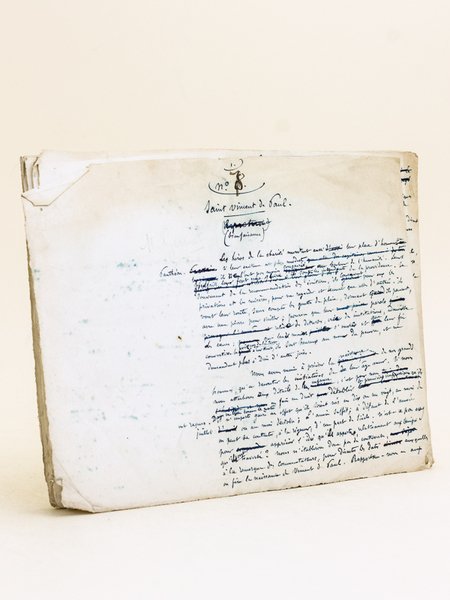 1 manuscrit autographe signé de 12 ff. rédigés au recto, format à l'italienne, s.d. (circa 1862) Le texte en a été publié dans l'ouvrage "Le Panthéon des Hommes Utiles", par Gustave Chadeuil et Hippolyte Lucas, E. Dentu, 1862, pp. 101-116 Ecrivain et journaliste français né à Limoges en 1823, Gustave Chadeuil, publia vite des romans et nouvelles dans une foule de journaux. Entré au Siècle comme critique musical, il sera l'un des fondateurs du Journal le XIXe siècle en 1871. Il rédigea le "Panthéon des Hommes Utiles" en collaboration avec Hippolyte Lucas, chaque auteur se partageant les biographies. Dans ce manuscrit autographe, abondamment corrigé, du chapitre consacré à Saint Vincent de Paul, on observe de nombreuses différences avec la version imprimée. Bon état (noms des typographes portés en marge)