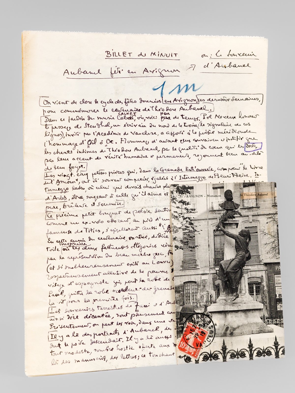 [ Manuscrit autographe signé d'un article sur Théodore Aubanel ] Billet de Minuit : "Aubanel fêté en Avignon ou Le souvenir d'Aubanel" : "On vient de clore le cycle des fêtes données en Avignon ces dernières semaines pour commémorer le centenaire de Théodore Aubanel. Dans ce jardin du musée Calvet, où, voici peu de temps, Pol Neveux honorait le passage de Stendhal, un écrivain du nord de la Loire (le signataire de ces lignes), invité par l'Académie du Vaucluse, a apporté à la poésie méridionale l'hommage d'Oïl à Oc. Hommage d'autant plus convaincu et justifié que les chants intimes de Théodore Aubanel, par la qualité de coeur qui les dicte, par leur accent de vérité humaine et permanente, rayonnent bien au-delà de leur foyer. Les vingt-cinq