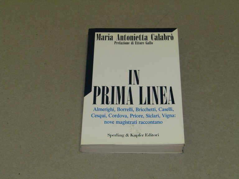 Maria Antonietta Calabrò Maria Antonietta Calabrò. In prima linea. Milano, Sperling & Kupfer 1993 - I italiano, in ottavo pp.XXX + 226 Raccolta delle testimonianze di nove magistrati. Pagine leggermente ingiallite. Copertina brossurata con alette.