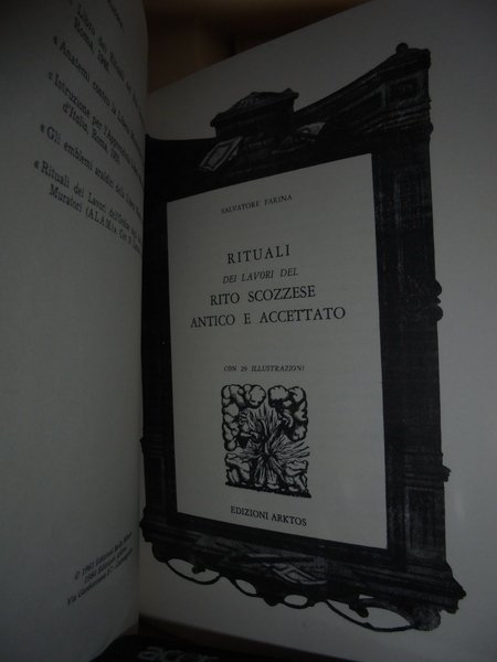(Massoneria) Farina, Salvatore. Carmagnola, Edizioni Arktos, 1984. Rituali dei Lavori del Rito Scozzese antico e accettato. In-8°, cartoncino edit. con alette. xvi, 336, (1) pp. con 29 illustrazioni. Come nuovo. Uff. magaz. Mass.