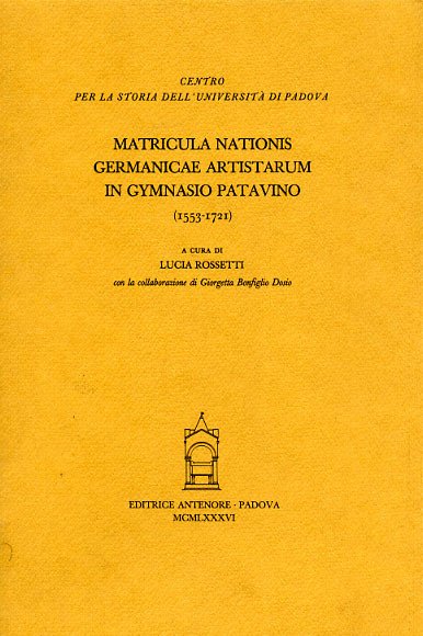 A cura di Lucia Rossetti, collaborazione di Giorgetta Bonfiglio Dosio. Padova, Ed.Antenore 1986, cm.17x25, pp.XVIII,508, brossura a fogli chiusi. Coll.Fonti per la Storia dell'Università di Padova. Fonti,10. Vol. facsimile, "Natio Germanica", III.Matricula Artistarum. STATO: NUOVO. EAN: 9788884553263