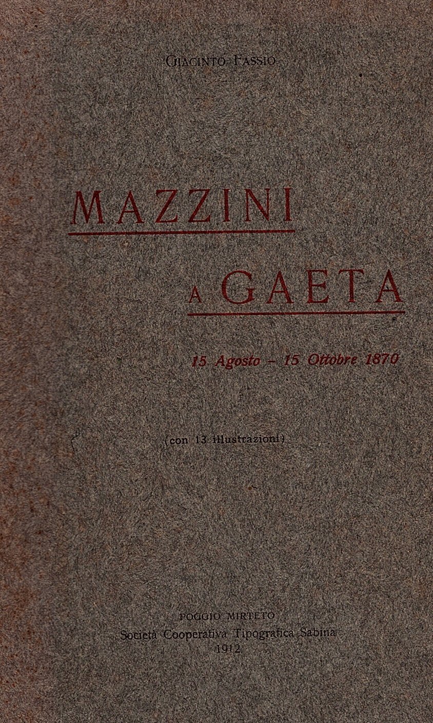 In-8° (20x14 cm), brossura editoriale grigia con titoli in rosso al piatto anteriore. Pp 160, (2), all'antiporta ritratto di mazzini, 10 tavole in bianco e nero fuori testo di cui alcune ripiegate (8 fotografiche). Lievi e fisiologici arrossamenti e fioriture ad alcune carte ma più che buon esemplare genuino. Saggio storico sulla prigionia di Giuseppe Mazzini nel carcere militare di Gaeta redatto da chi come l'autore ne ebbe conoscenza diretta in quel frangente.