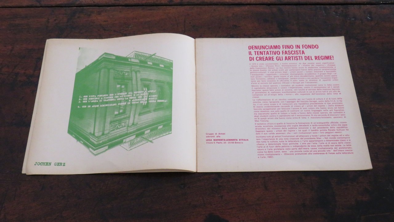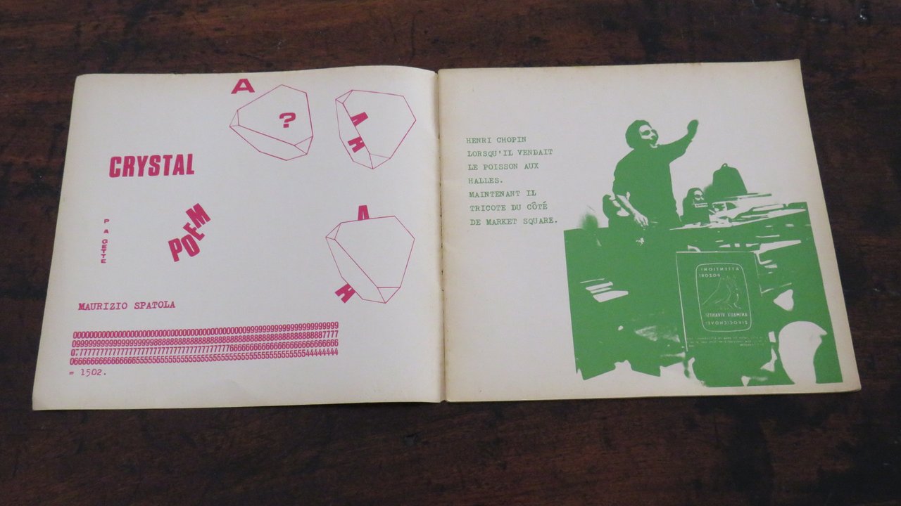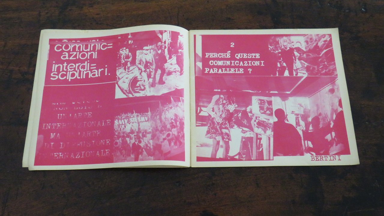 Milano, Gianni Bertini. In -8 quadrato (mm. 250x230), pp. 24 non numerate, compresi i piatti anteriore e posteriore. Brossura editoriale con punti metallici, con titolo in verde al piatto anteriore, illustrata in verde al piatto posteriore. Stampato a colori verde e magenta. Rivista di comunicazioni visive e accertamenti poetici, diretta da Gianni Bertini. Con contributi poetici, visuali e concreti, di Henri Chopin, Gianni Bertini, Jochen Gerz, Heinz Gappmayr, Ugo Locatelli, J.F. Bory, Eugenio Miccini, Clemente Padín, Kitasomo Katué, Gérald Rocher, Shimizu Toshihiko, François Dufrêne, Claudio Parmiggiani, Michele Perfetti, Salvatore Passarella, Takahashi Shohachiro, Maurizio Spatola, Jiří Valoch, Fernando Millan, Tino Stefanoni. Comunicato del "Gruppo di Artisti aderenti alla Lega Marxista-Leninista d’Italia". Testo in italiano, francese e inglese. Prima edizione. Lievi tracce di foxing al dorso e ai margini della brossura, anteriore e posteriore, ma nell’insieme ottimo esemplare.