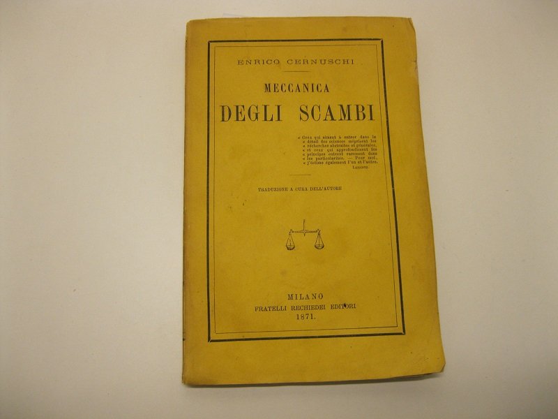 In 16, pp. 224. Intonso. Br. ed. con lievi danni al d. Ed. originale italiana di quest'opera pubblicata in Francia nel 1865. Fu con questo studio che Cernuschi inizio' ad essere considerato nel novero degli economisti emergenti. Nell'opera egli sostiene che lo scambio nelle sue leggi e applicazione e' una scienza esatta come la meccanica. Tutti i contratti sono dei cambi e il contratto di societa' non fa eccezione: vi si scambia il bene individuale contro una parte di bene sociale. Nell'esame della questione monetaria ritiene che se l'oro in deposito nei forzieri dello stato diminuisse, i prezzi delle merci diminuirebbero.