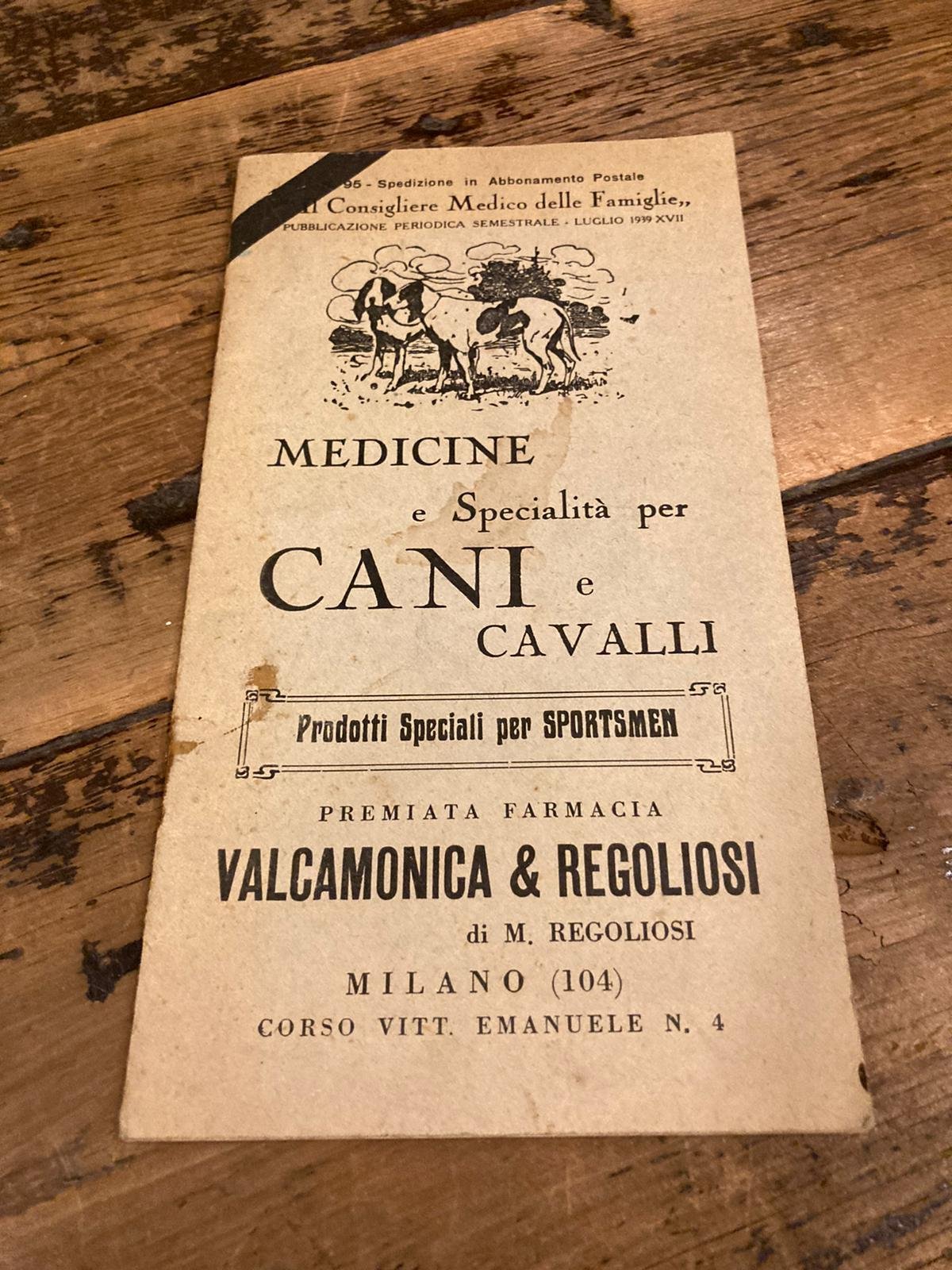 In-16° stretto (19.5x11 cm), brossura editoriale spillata con titoli al piatto anteriore figurato e paratesti pubblicitari al posteriore. Pp 23, (1), contropiatti figurati. Lievi macchie al piatto posteriore ma buon esemplare. Non comune numero monografico del periodico semestrale 'Consigliere Medico delle Famiglie' (N° 95, Luglio 1939) interamente dedicato a rimedi per l'igiene e per la salute dei cani e dei cavalli.