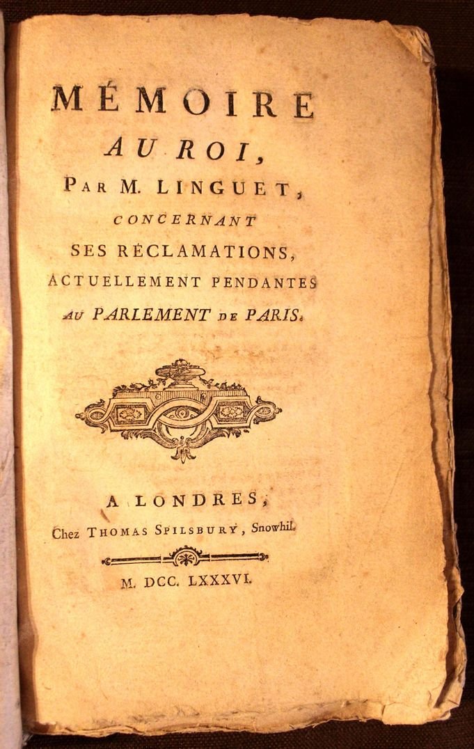 In 8°, pp. 243 (1). Brossura muta dell’epoca. Buon esemplare, fresco e con ampi margini. Accorata richiesta indirizzata al Re da Simon Linguet per la sua riabilitazione al foro di Parigi, undici anni dopo la sua esclusione. Giornalista virulento, avversario del partito dei filosofi, nel 1777 andò in esilio a Londra dopo essersi alienato gli appoggi politici e letterari francesi. Protetto dal Re Luigi XVI e da Giuseppe II d’Austria, che si spese per favorire il suo ritorno in Francia rientrò in patria nel 1783. Arrestato durante il Terrore con l’accusa di avere pubblicato, prima della rivoluzione, articoli elogiativi nei confronti delle monarchie straniere venne ghigliottinato il 27 giugno 1794 a Parigi.