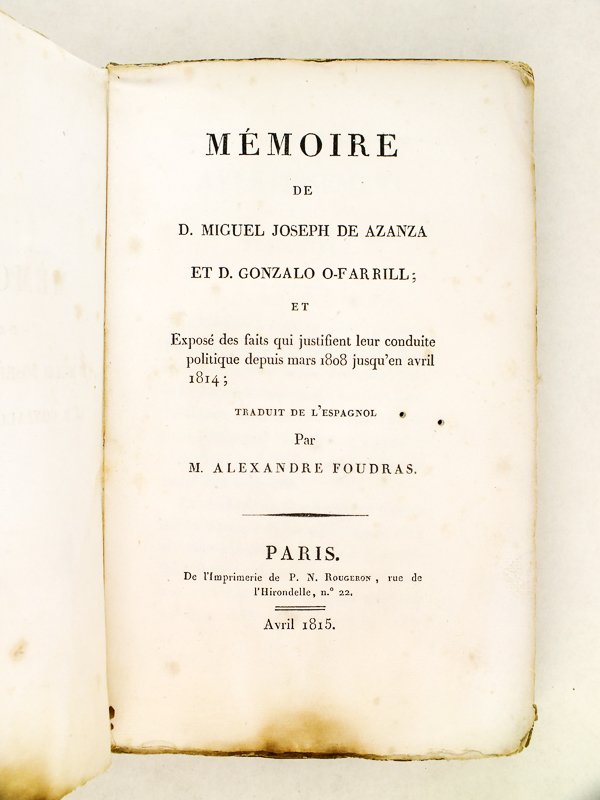 Traduit de l'espagnol par M. Alexandre Foudras, 1 vol. in-8 br. sous couv. d'époque, De l'Imprimerie de P. N. Rougeron, Paris, Avril 1815, 2 ff., iii-325 pp. "Témoignage intéressant mais partial sur la genèse de l'affaire d'Espagne" (Tulard, 29). Etat satisfaisant (deux piqûres de vers affectant lég. le texte sur la moitié de l'ouvrage, petite brunissure aux premiers ff. en queue).