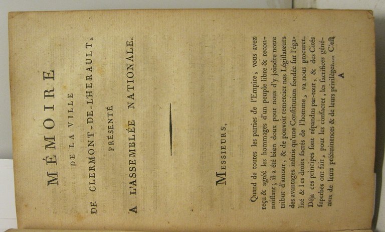 In 8, pp. 4. Br. muta coeva. Appello all'assemblea nazionale affinche' venga posta in Clermont de l'Herault la sede del Tribunale del distretto. A questo fine vengono esposti sette punti a sostegno della candidatura.