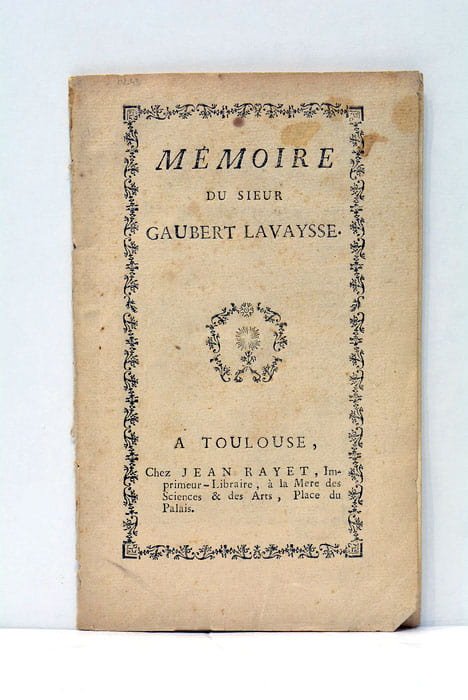 1 feuillet. 26 pages. (18,5x11,5 Cm). Broché. Couverture imprimée. Quelques taches. Edition Originale peu commune de ce mémoire contemporain du premier jugement de la célèbre "affaire Calas". Il fut rédigé pour sa défense par Gaubert Lavaysse, un ami de la famille Calas accusé aux côtés de Jean Calas, et qui fut finalement acquitté. Le 9 mars 1765, au terme d'une longue bataille juridique dans laquelle Voltaire s'était engagé pleinement, un tribunal extraordinaire de cinquante maîtres des requêtes cassa l'arrêt du Parlement de Toulouse, réhabilita la mémoire de Calas et ordonna que sa famille fût indemnisée. Rares rousseurs.