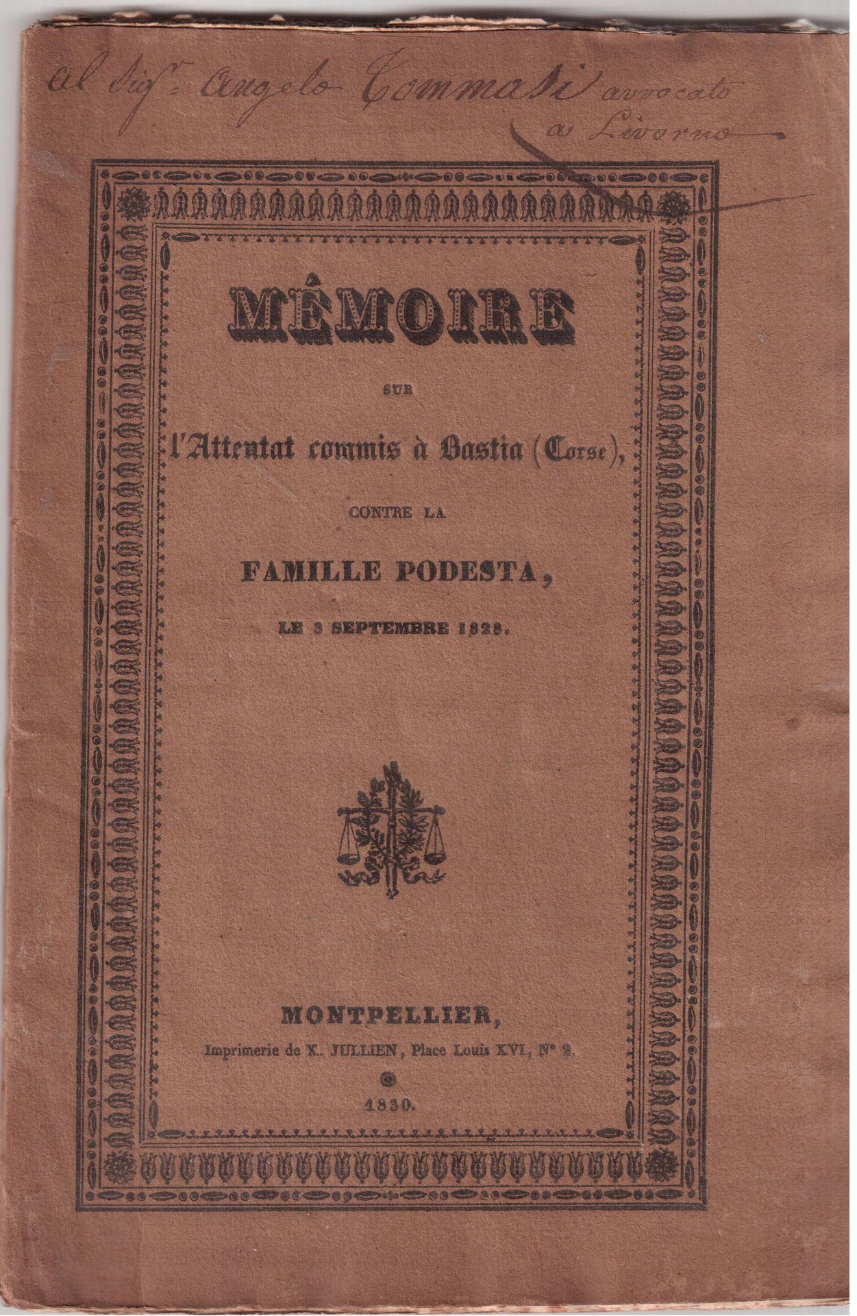 Mémoire sur l'attentat commis a Bastia ( Corse ) contre la famille Podestà le 3 septembre 1828