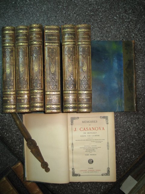 8 voll. in-8° (237x160mm), pp. (3), XXXI, 478, (1); (3), 509, (1); (3), 503; (3), 512; (3), 546, (1); (3), 533, (1); (3), 538, (1); (3), 534, (1); legatura coeva m. pelle marrone con dorsi a nervetti decorati in oro e adorni di titolo in oro e di fregi ornamentali impressi in oro e a secco. Tagli di testa dorati, piatti e fogli di guardia marmoreggiati. Brossure originali conservate. Antiporta xilografica a ciascun volume e 128 vignette xilografiche n.t. di de Maillart. Piccoli restauri alle cuffie e alle cerniere di alcuni volumi. Ottimo esemplare. Edizione illustrata e riveduta testualmente sull'edizione originale del Brockhaus di Lipsia. '.Uno dei documenti più importanti della vita del Settecento. L'opera introduce a un mondo che pochi memorialisti descrivono con tanta sagacia. Nel Casanova al di là della stessa apparenza frivola e crudamente sensuale c' è un carattere cosmopolita per l'interesse alle varie questioni dell'epoca e le relazioni con Caterina II e Federico di Prussia, il Voltaire e il Rousseau, il Goldoni e il Galiani, oltre che con Benedetto XIV e Clemente XIV, e di necessità con Maria Teresa e Giuseppe II' (Carlo Cordié in Dizionario Bompiani delle Opere, VII, p. 117).