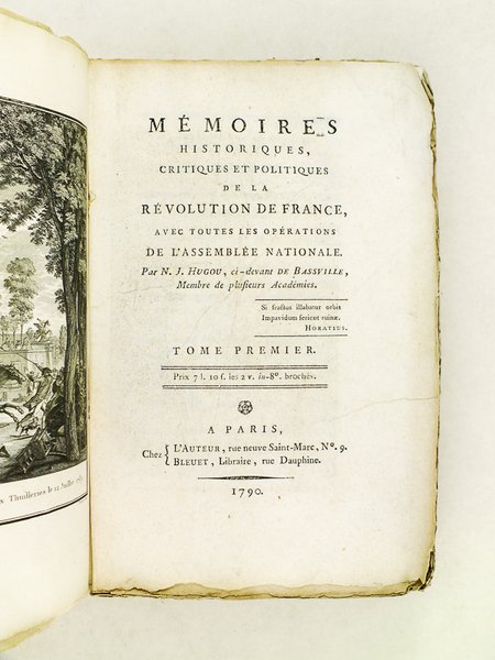 2 tomes en 1 vol. in-8 br. sous couv. d'époque, Chez l'Auteur, Chez Bleuet, Paris, 1790, 2 ff. (faux-titre et titre), frontispice, pp. x-xv, lxxxxvj-116-152 pp. Tome I seul (sur 4). Etat très satisfaisant (accroc en couv., très bon état par ailleurs). Journaliste et diplomate français, l'auteur sera assassiné à Rome lors d'une mission particulière le 13 janvier 1793.