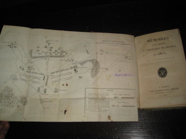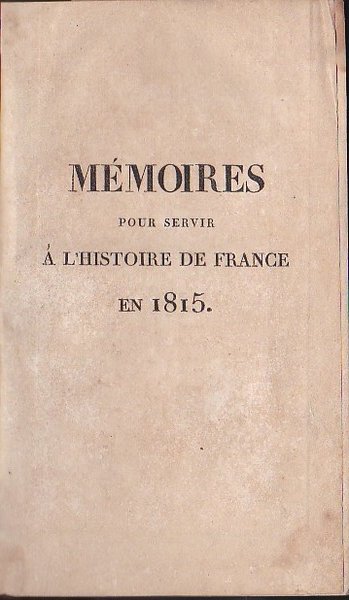 In-8°, pp. VI; 5-118 + LXXVI di 'Pièces officielles'. Legatura dell'epoca m. pelle marrone e punte con titolo in oro su tassello, filetti e decori in oro al dorso. Piatti marmorizzati. Una tavola ripiegata incisa su rame all'antiporta della battaglia del Mont Saint Jean, 2 tabelle ripiegate fra le pp. 74-75; 6 tabelle a p. pag. intera in fine e, sempre in fine, ripiegata, altra grande tabella (le tabelle in fine sono contrassegnate con lettere dalla A alla G; quella ripiegata è la tabella F). Sparse bruniture. Un'annotazione marginale ad una delle tabelle ripiegate. Una mancanza marginale con perdita di testo alla seconda tabella. Edizione originale. Frammento sulla storia militare e politica dei Cento Giorni steso dall'Imperatore in esilio e che recava all'origine il titolo di 'Second Mémorail venu de Saint Hélène'; il manoscritto fu affidato all'O'Meara, medico di Napoleone a Sant'Elena. 'Ces Mémoires, aussi curieux par les faits nouveaux ou peu connus qu'ils nous apprennent, que par une narration concise, rapide et brillante, nous ont paru mériter l'attention de cuex qui veulent connaître l'histoire de notre temps' (dall'avvertenza editoriale, siglata C. B., ossia Charles Barrois). Tulard, 1079. Barbier, III, 236: 'Cet ouvrage forme le IXe livre des 'Memoires de Napoléon'. Il continent l'histoire militaire des Cent - Jours. Ces Mémoires, saisis à la raquete du ministére public, furent rendus à la circulation par arrét de la Cour d'assises du 21 mars 1820'.