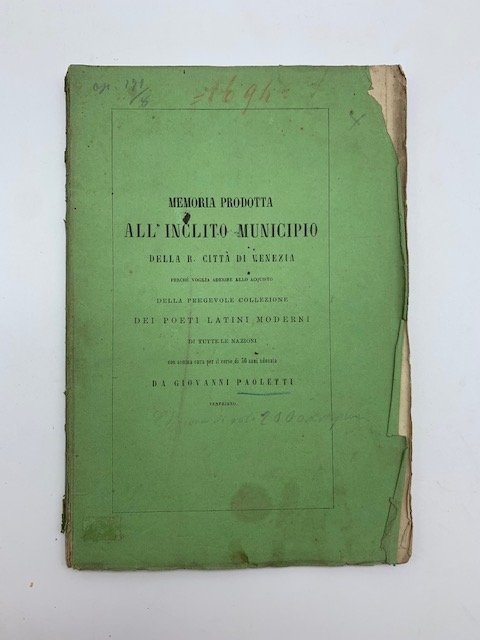 In 8 (cm 15,5 x 23), pp. 63 + (1). Brossura editoriale. Edizione di soli 200 esemplari. Lettera dedicatoria, in apertura, a Girolamo Soranzo. Memoria in cui Giovanni Paoletti, libraio, maestro e direttore scolastico a Venezia, presenta al Municipio cittadino, affinche' la acquisti, la propria collezione di opere di poeti latini moderni di tutte le nazioni, collezione da lui raccolta nell'arco di 36 anni. Cfr. "Guida fedele del forestiero per la citta' di Venezia": "Terzo giro. Canal Grande a sinistra. Palazzo semplicissimo, ora abitato dal libraio Giovanni Paoletti, il quale ha una preziosa raccolta di antiche edizioni, di cui fa commercio", 1868, p. 84. Ottino, Bibliotheca bibliographica, p. 259. Varie sono le acquisizioni di biblioteche e fondi importanti fatte da Paoletti: ad esempio compro' la collezione di Antonio De Martiis, costituita da circa ventimila volumi di classici e centododici volumi di opuscoli legati, nel 1769 aveva acquistato la biblioteca della famiglia Corner, acquisto' la collezione della famiglia Barbaro di San Vitale, ecc.