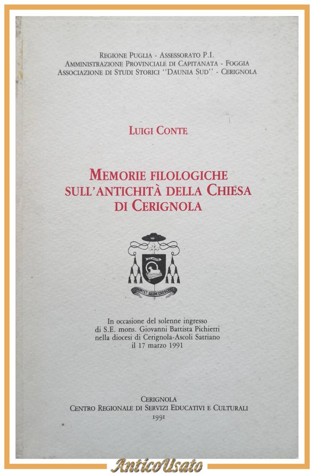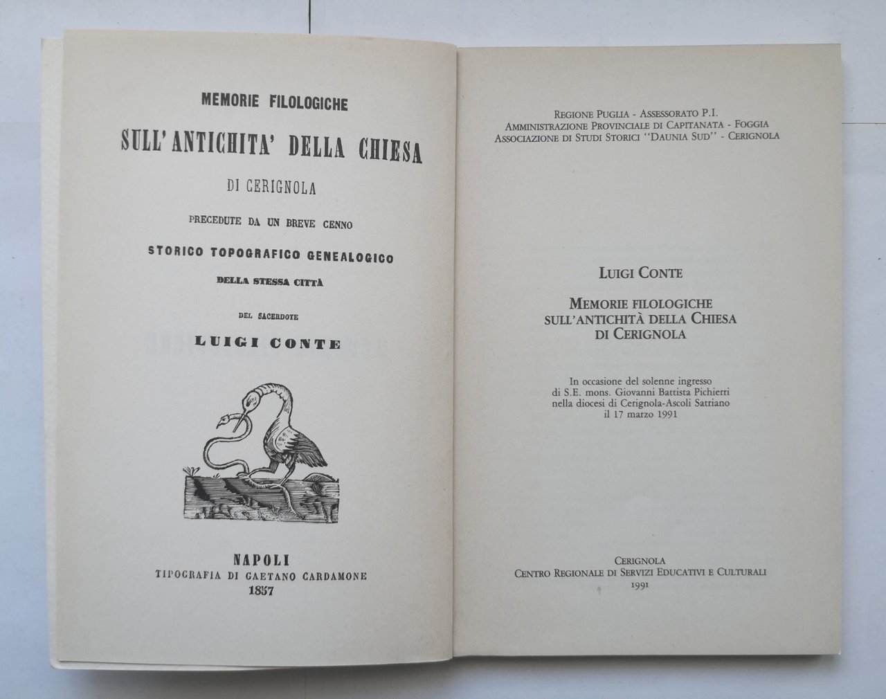 MEMORIE FILOLOGICHE SULL'ANTICHITÀ DELLA CHIESA DI CERIGNOLA L Conte 1991 Libro