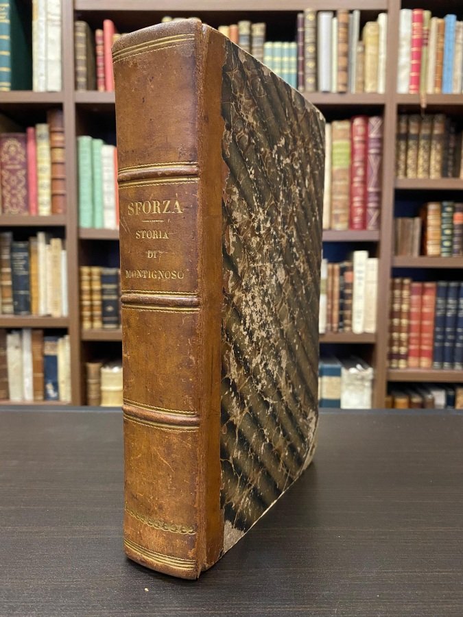 In-8° (cm. 22,5), legatura coeva in mezza pelle nocciola, dorso a nervi con titolo, filetti e fregio floreale in oro, piatti marmorizzati (alcune tracce d'uso alle cerniere e lievi abrasioni); pp. [4] 437 [3b] in buono stato (lievi fioriture sparse e tracce d'uso); con 3 vedute litografiche della fortezza incise da L. Bertini e poste fuori testo (l'una vista da Pettinaiola e ripetuta due volte, l'altra dalla ferrovia); 1 grande carta con la Pianta della Fortezza di Montignoso più volte ripiegata fuori testo in fine; allegate 2 tavole sempre ripiegate fuori testo in fine contenenti un sonetto di Emilio Ferrari e la dedica "A Giovanni Sforza, autore delle Memorie storiche di Montignoso" inquadrate in cornice. Prima e non comune edizione di questo studio essenziale sulla fortezza di Montignoso, terra natale dello Sforza situata tra la Riviera Apuana e la Versilia. Buon esemplare. (SA2)