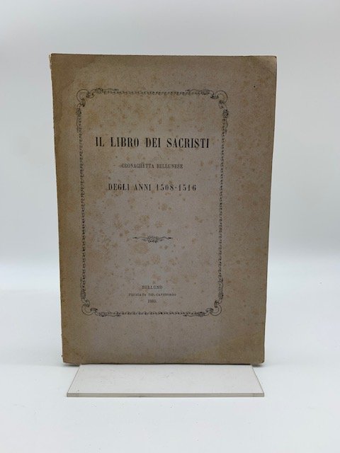 In 8 (cm 16,5 x 24), pp. 86. Dedica autografa alla prima carta bianca. Brossura editoriale con fioriture ai piatti. Il piatto anteriore ripota titolo differente "Il libro dei Sacristi. Cronachetta bellunese degli anni 1508-1516". Tra i manoscritti del Museo civico di Belluno vi e' un codice frammentario del XVI secolo di pugno dello storiografo Giorgio Piloni. Esso comprende alcuni frammenti di annotazioni latine dal titolo "Ex libro sacristarum" (ovvero dal Libro dei sacrestani). Le annotazioni risalgono al periodo durante il quale si combatte' la guerra della lega cambraica contro Venezia e formano una cronichetta o diario dei fatti meno rilevanti, rispetto a quelli della guerra, accaduti nella citta' di Belluno. Dopo l'introduzione iniziale, sono quindi riprodotti i testi latini di questa Cronaca della citta' di Belluno dal titolo 'Fragmenta Chronica de bellis in territorio bellunensi gestis ab anno 1508 ad 1516 excerpta e Libro sacristarum".