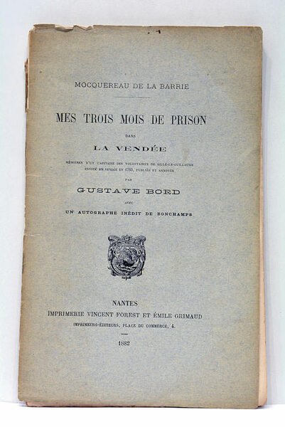 Mes trois mois de prison dans la Vendée. Mémoires d'un Capitaine des Volontaires de Sillé-le-Guillaume envoyé en Vendée en 1793, publiés et annotés par Gustave Bord. Avec un autographe inédit de Bonchamps.