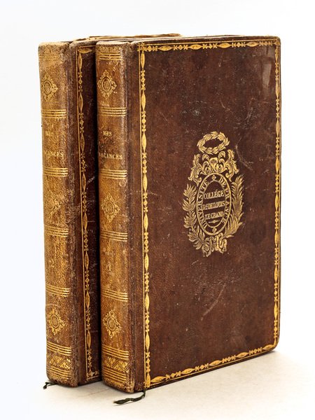 Orné de trois cartes routières et de neuf jolies gravures, 2 vol. in-12 reliure de l'époque pleine basane marron, dos lisse orné, fers du Collège Royal de Louis le Grand aux plats, Chez l'Auteur, rue d'Assas, et chez Delloye, Paris, 1837, 322 pp. Complet des 3 grandes cartes dépliantes et des 9 gravures hors-texte. Etat satisfaisant (reliure frottée avec petits accrocs, rouss.)