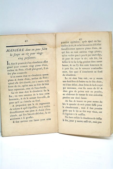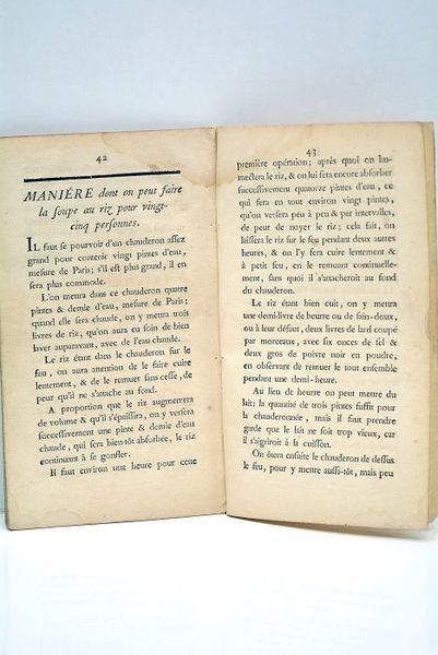 in-12. 46 pages. Dérelié. Taches. Traces de mouillures. Petites déchirures. Très bon état général. Méthode médicale réduite, à caractère préventif et divulgatif, destinée à la campagne. La Méthode est suivie d'une Manière dont on peut faire la soupe au riz pour vingt-cinq personnes, où l'on précise aussi quelques précautions hygiéniques concernant sa cuisson et conservation.