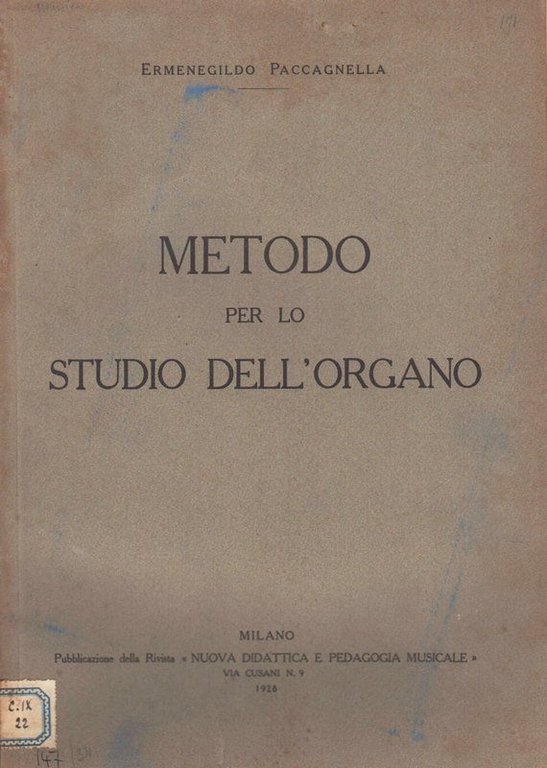 In-4°, legatura editoriale in brossura, pp. 80. Al dorso etichetta d'archiviazione della biblioteca di Costanzo Ciano. In buono stato di conservazione - non comune. Ermenegildo PACCAGNELLA (Salboro, 18 febbraio 1880 – Roma, 28 luglio 1975) è stato un organista, compositore e musicologo italiano. Tra il 1899 e il 1905 studiò pianoforte con Cesare Pollini, organo e composizione con Luigi Bottazzo all’Istituto musicale di Padova. Avviò presto un’intensa attività concertistica come organista, esibendosi in varie città d’Italia. Nel 1911-12 insegnò organo nel Conservatorio di Malmö in Svezia; tornato in Italia, nel 1913 assunse il ruolo di organista nella chiesa metropolitana di Vercelli e di docente di organo nel Civico istituto musicale di Novara. Nel 1920 rinunciò al concertismo per dedicarsi esclusivamente all’insegnamento. Stabilitosi a Milano, fondò l’Istituto sperimentale di musica, dove applicò un metodo pedagogico-didattico da lui ideato, che integrava i diversi aspetti della disciplina musicale: dall’esecuzione strumentale alla teoria, alla composizione.