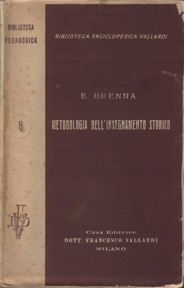 In-16° (cm 19,8 x 12,8), pp. XVI, 216, copertina editoriale con tracce d'uso e del tempo (in particolare, qualche strappetto, ben riparato ai bordi e una piccola mancanza nella parte inferiore del dorso). Leggerissimi, piccoli segni d'umido all'occhietto e a p. III. Nel margine esterno dei fogli che ospitano le pagine 19-20 e 93-94, lontano dal testo, strappetto, di minima entità, ben rimarginato con carta giapponese. Lungo il bordo esterno del foglio con le pagine 69-70, piccole macchie d'inchiostro, anche in questo caso lontano dal testo. Piccolissima mancanza nell'angolo inferiore esterno delle pagine 209-216. Normale patina del tempo alle pagine, con leggere arrossature ai margini dovute al tipo di carta. Volume numero 8 della collezione "Biblioteca pedagogica", facente parte della "Biblioteca Enciclopedica Vallardi". Indice: Capitolo I. Oggetto, metodo, natura e compito della scienza storica; Capitolo II. La storia come disciplina d'insegnamento. Le obbiezioni all'insegnamento storico nei primi gradi della cultura; Capitolo III. In difesa della Storia nella scuola popolare; Capitolo IV. Cenni storici sull'insegnamento della Storia; Capitolo V. La preparazione all'insegnamento storico nella scuola elementare; Capitolo VI. La limitazione, la scelta e la distribuzione del materiale; Capitolo VII. Il metodo dell'insegnamento storico: i metodi d'insegnamento rispetto alla collocazione dei fatti storici nel tempo; Capitolo VIII. i metodi d'insegnamento rispetto alla collocazione dei fatti storici nello spazio; Capitolo IX. i metodi d'insegnamento riguardanti la storia in rapporto alle altre discipline scolastiche; Capitolo X. i metodi d'insegnamento rispetto alla forma di rappresentazione; Capitolo XI. i metodi d'insegnamento rispetto alla distribuzione della materia nei singoli anni; Capitolo XII. i metodi d'insegnamento riguardo all'accoppiamento della materia; Capitolo XIII. i metodi d'insegnamento storico rispetto alla natura e alla comprensione; Capitolo XIV. Riassumendo intorno ai metodi; Capitolo XV. I sussidi dell'insegnamento storico con particolare riguardo al libro di lettura; Capitolo XVI. Il piano didattico dell'insegnamento storico nella scuola popolare. Classe V. Storia Romana e Medioevale; Capitolo XVII. Il piano didattico dell'insegnamento storico nella scuola popolare. Classe VI. Storia Moderna; Capitolo XVIII. L'insegnamento della Storia nella scuola normale e la preparazione dei maestri. Appendice bibliografica.