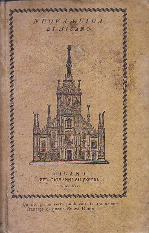 In-12° (162x102mm), pp. (2), VIII, 519, (1) di errata, cartonatura editoriale con xilografia raffigurante il Duomo di Milano entro bordura zigzagante. Tagli a spruzzo rossi. Vignetta calcografica al titolo. Tabelle con itinerari di viaggio a Milano diviso in 10 giornate alle pp. 475-497. Restauri al dorso.Qualche brunitura. In buono stato. Come quasi sempre manca la pianta ripiegata di Milano antica e moderna, che poteva essere acquistata anche separatamente e, di conseguenza, solo talvolta era allegata alla guida. Prima edizione, rara, di questa pregevole e fortunata guida storico-artistica di Milano composta da un pittore locale. Divisa in 11 capitoli, la guida tratta del culto, chiese e Duomo, di palazzi e piazze, dei rami dell'amministrazione, delle scuole, degli ospedali, delle fabbriche e manifatture, di gallerie e musei, degli alberghi e locande. Villa, Bibliografia delle Guide di Milano, 159: 'La I edizione, stampata nel 1822, fu riproposta senza interruzione sino al 1830'. Predari, 14, 444. Schlosser, 495. Milano nei suoi libri e nelle sue stampe, p. 283.
