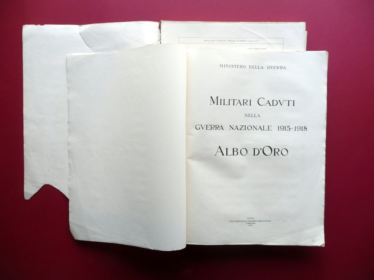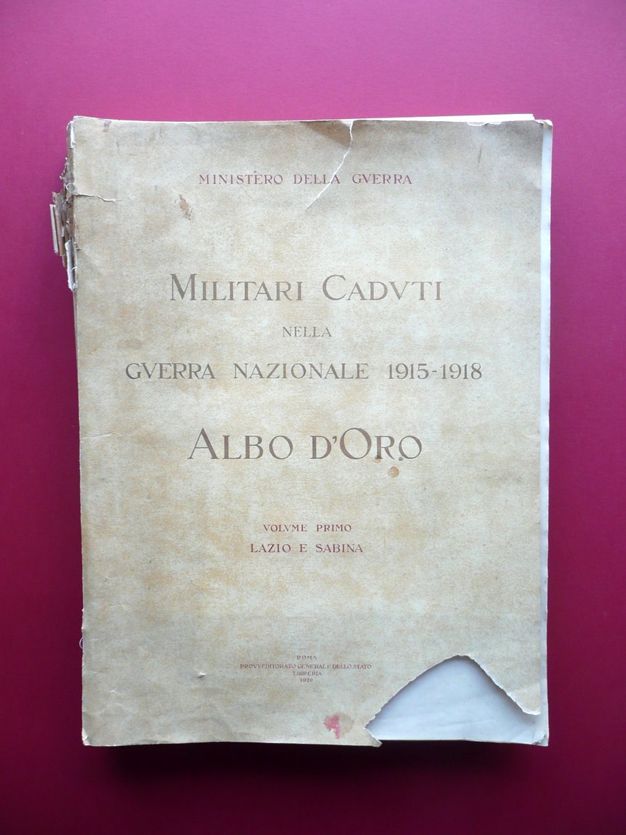 Ministero della Guerra, Militari Caduti nella Guerra Nazionale 1915-1918 Albo d'Oro volume primo Lazio e Sabina Provveditorato Generale dello Stato - Libreria, Roma 1926; cm 42,5x32; pp. VIII-606; a pagina III lettera autografa fac simile di Mussolini (vedi foto); brossura ed. Condizioni di conservazione Esemplare in discrete condizioni con tracce d'uso, alcune piccole / minime bruniture; coperta con alcuni strappetti e qualche mancanza ai margini e al dorso. Cerniere interne fessurate con conseguente distacco delle prime 80 pagine e con allentamento delle cuciture (vedi foto). Dettagliatissimo elenco dei caduti nella guerra del '15 - '18, appartenenti all'area del Lazio - Sabina. Esemplare raro. Condizioni com da foto e da descrizione. SETT26.L15657 N