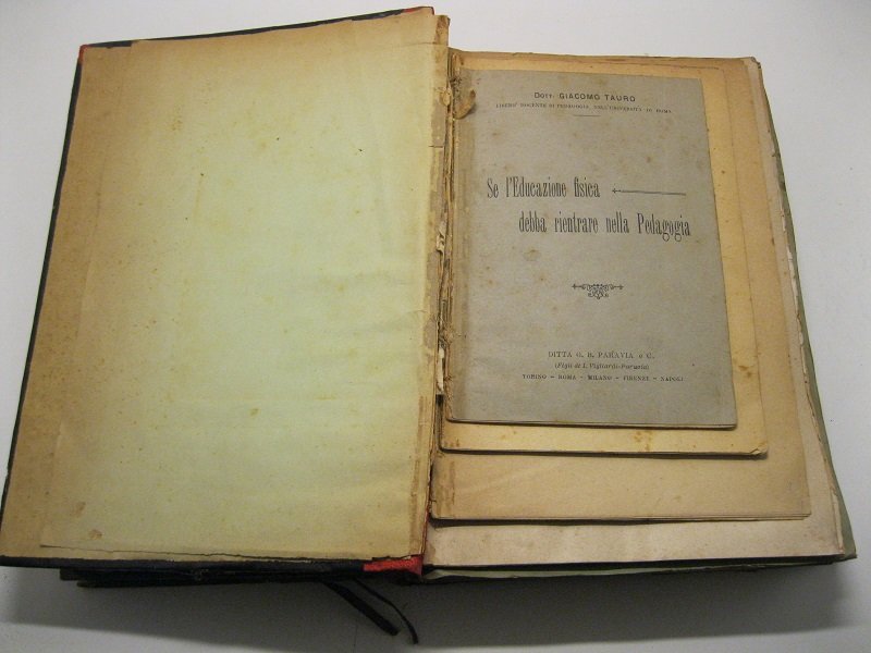 24 voll. in vario formato e nn. di pp. , pubblicati tra il 1882 e il 1911, riguardo alla ginnastica ed al suo insegnamento nelle scuole. Citiamo: dott. Giacomo Tauro - Se l'Educazione fisica debba rientrare nella Pedagogia; dott. Ettore Patini - La teoria dell'allenamento al lavoro muscolare - La stanchezza da lavoro muscolare; Scuole Comunali di Roma -L'educazione fisica nelle Scuole Primarie; dott. Giacomo Tauro - Ginnastica del corpo e ginnastica dello spirito; R. Guerra - Ginnastica della mente e ginnastica del corpo; Adolfo Fasano - Il crampo degli scrittori; dott. Gaetano Pini - Una questione d'igiene pedagogica; dott. Giovanni Orsi - Importanza igienica della educazione fisica - Relazione a S. E. il ministro della pubblica istruzione sull'igiene, con speciale riguardo all'educazione fisica; Giuseppe Pezzarossa - Gli attrezzi di Ginnastica; Romano Guerra - L'indirizzo della ginnastica sociale in Italia; Prof. Baccio Benucci - I caratteri sociali dell'educazione fisica; (a. m. ) - L'educazione fisica italiana e le panzane del prof. Angelo Mosso; Romano Guerra - Le riforme dei vigenti programmi di Educazione Fisica; Prof. Antonio Di Muro - Pedagogia e ginnastica; (a. m.) - Terzo congresso nazionale degl'insegnanti di ginnastica, tenuto a Genova ; Francesco Pasciuti - La riforma dei ricreatori popolari e il falso indirizzo dato all'educazione fisica; prof. Romano Guerra - Relazione del Presidente della C. T. F., prof. Romano Guerra; prof. Attilio Fabozzi - Relazione sulla ginnastica all'istituto froebelliano - L'Educazione Fisica e' una necessita' sociale; Istituto nazionale per l'incremento dell'Educazione Fisica in Italia - Atti della prima riunione annuale ; Prof. Attilio Fabozzi - Terza riunione annuale dell'Ist. Naz. per l'incr. dell'Educ. fisica in Italia. L'educazione fisica degli operai.
