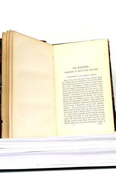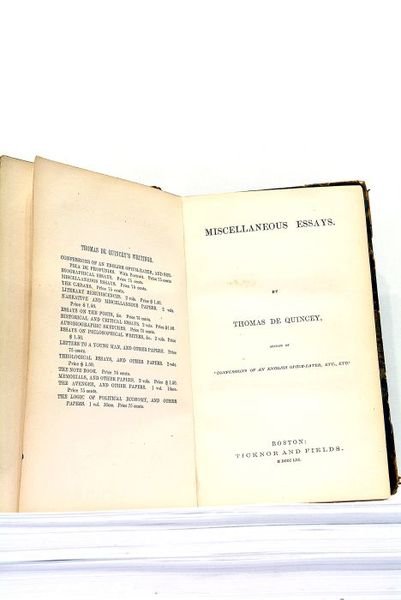 288 pages (11,5x18,5cm). Demi-cuir à coins. Reliure ancienne usagée. Coins émoussés. Plats frottés. Coiffes arrachées. La reliure se détache du corps du texte. Réparation au feuillet de garde. Quelques feuillets se détachent très légèrement. Assez bon exemplaire à l'intérieur. Livre en Anglais. "On the knocking at the Gate in Macbeth". "Murder, considered as one of the Fine Arts". "Joan of Arc". etc. Edition de Buston.