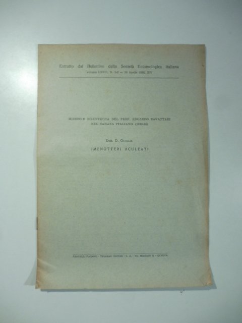 In 8 (cm 17 x 24), pp. 16. Brossura editoriale. Estratto editoriale dal Bollettino della Societa' entomologica italiana.